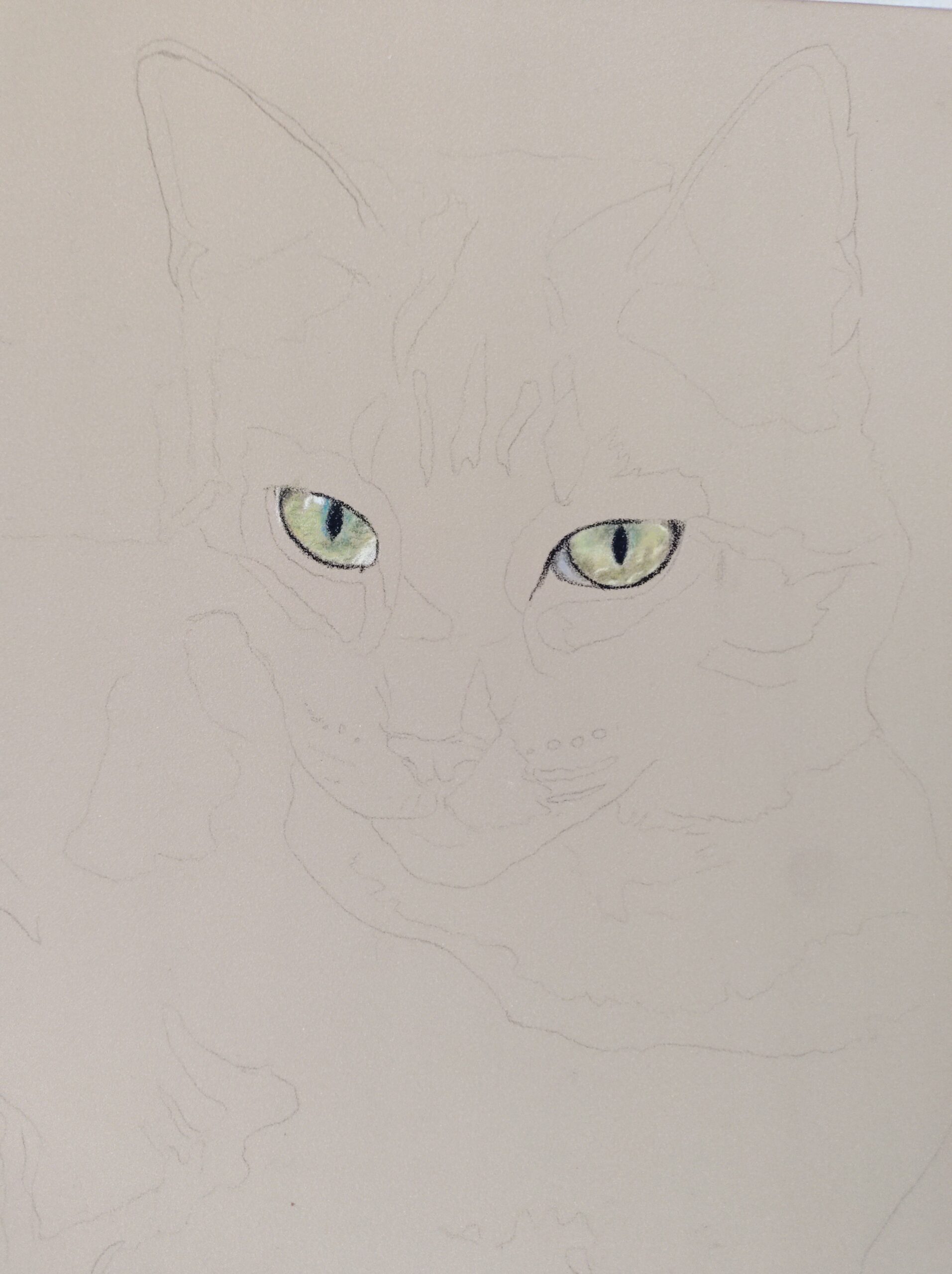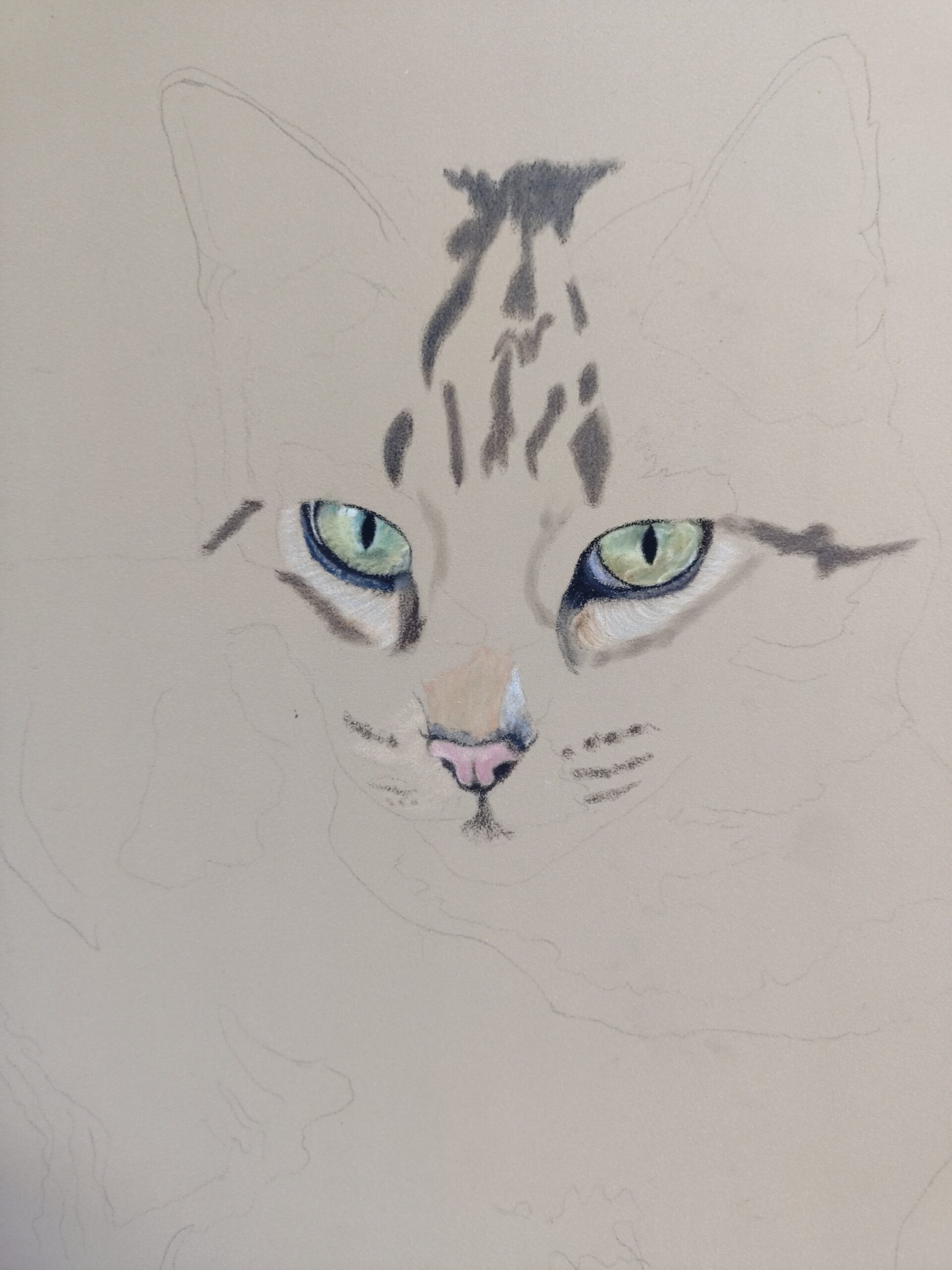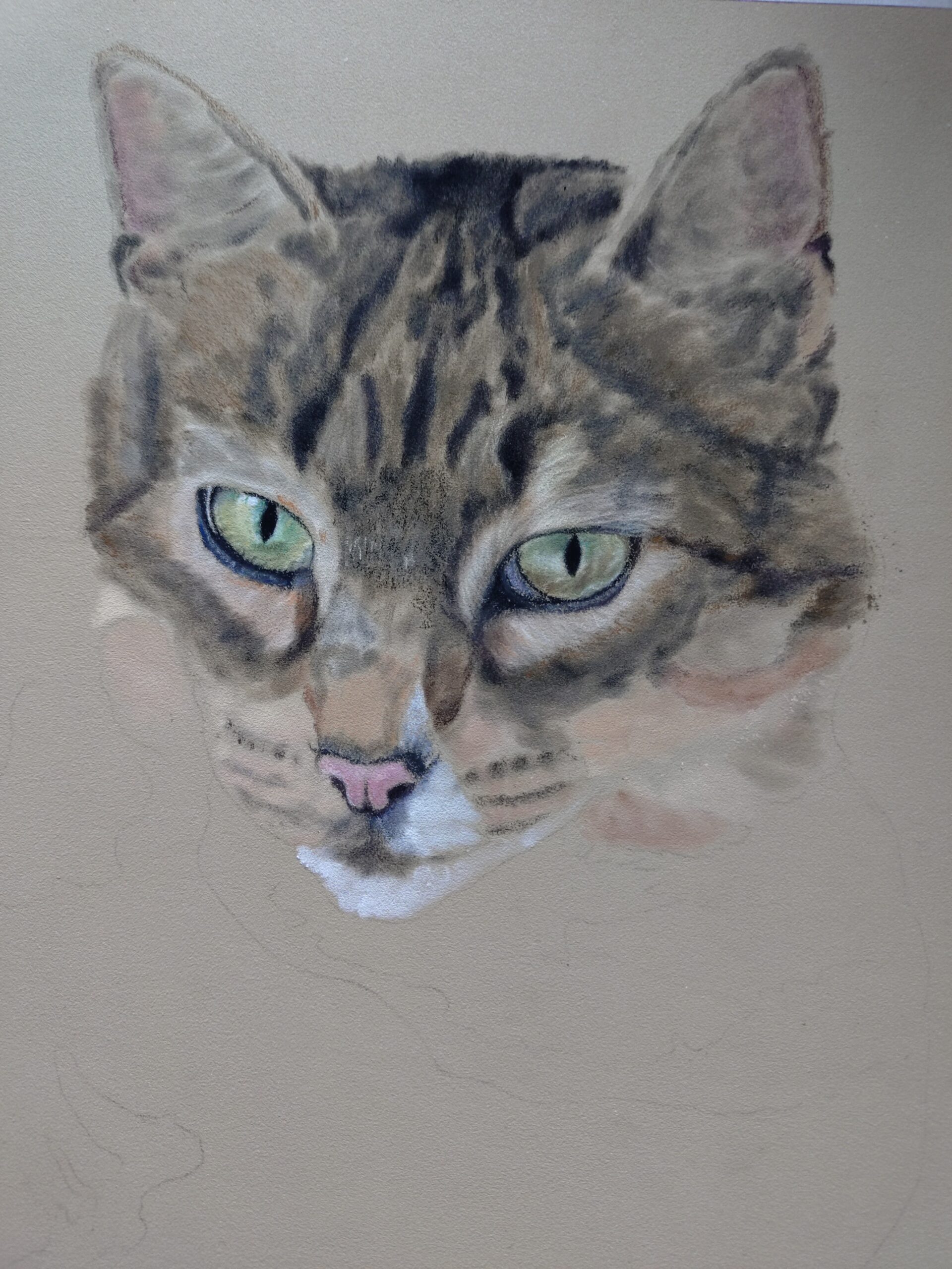 Ich benutze kein Fixativ, weil die Farben durch dessen Verwendung nachdunkeln und ihre Leuchtkraft verlieren und ich anfangs zwei Bilder ruinierte, weil der Sprühfilm unregelmäßig aus der Dose kam.